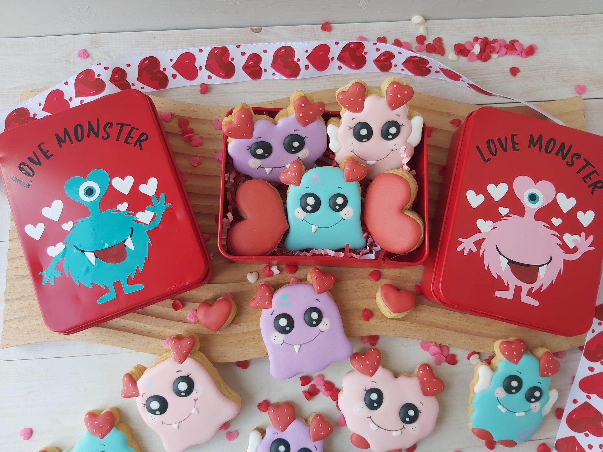 These cute love monster tins comes with 3 x mini monsters and 2 mini heart cookies.